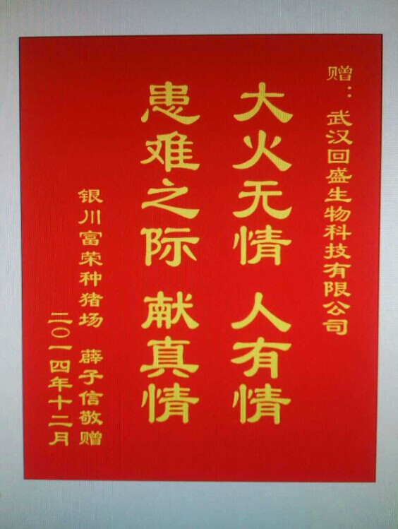 首先,請?jiān)试S我代表寧夏銀川富榮種豬場全體同事對回盛公司表達(dá)最衷心的感謝!2014年12月9日深夜兩點(diǎn),由于線路老化種豬舍不幸失火,直接損失經(jīng)產(chǎn)母豬88頭,后備母豬200頭,300多平米的種豬舍毀于一旦,經(jīng)濟(jì)損失達(dá)70萬余。