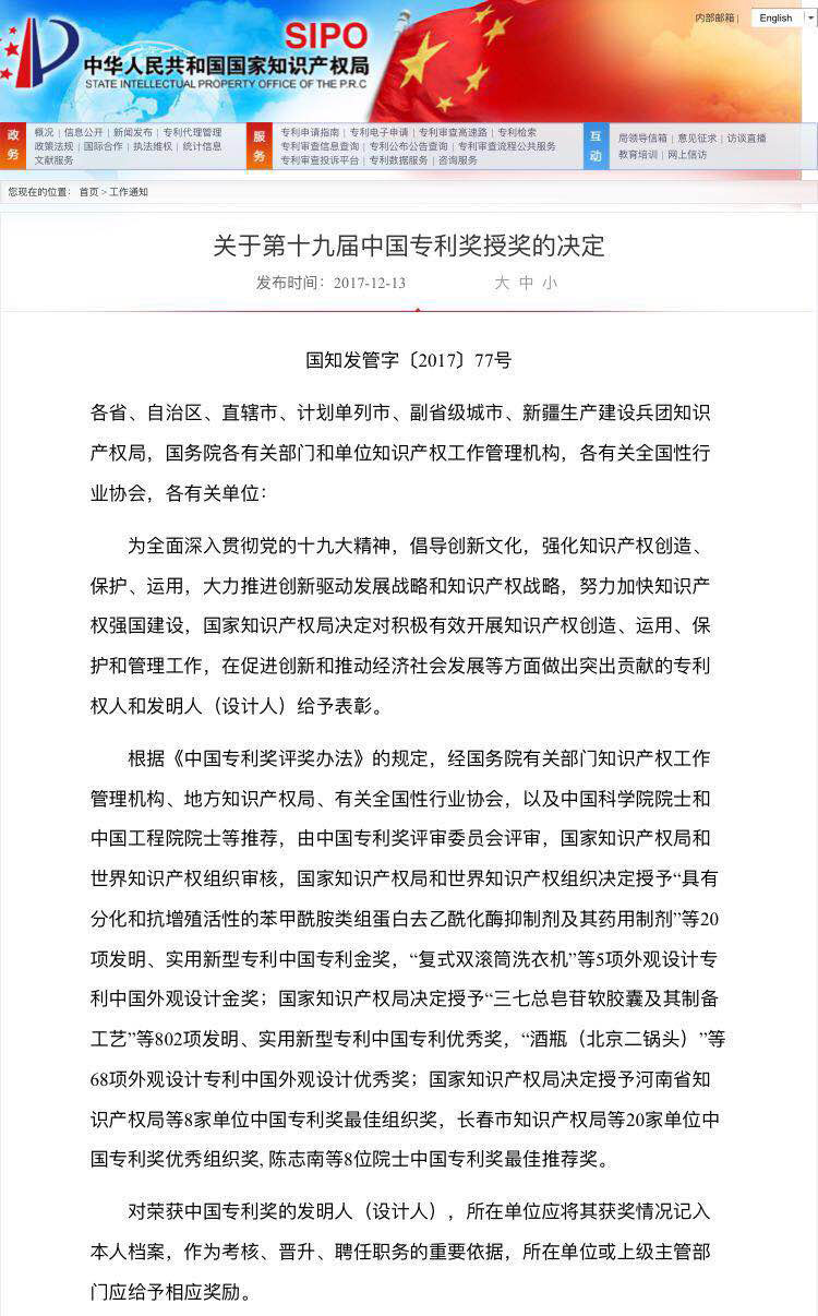 榮獲第十九屆中國發(fā)明專利優(yōu)秀獎,是孝感歷史上專利榮獲的最高獎項(xiàng)。
